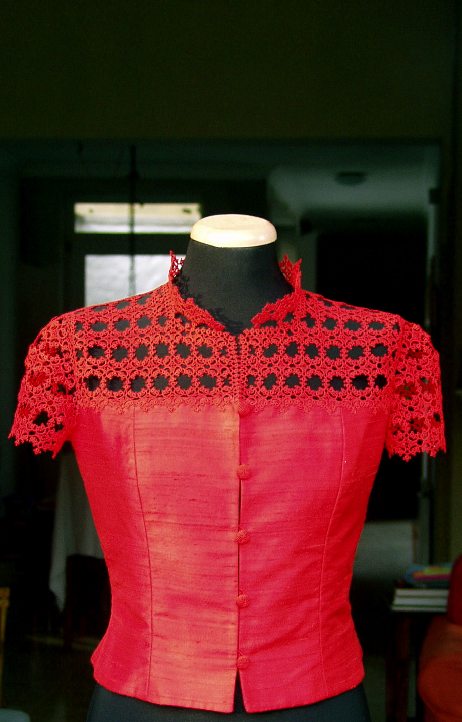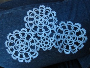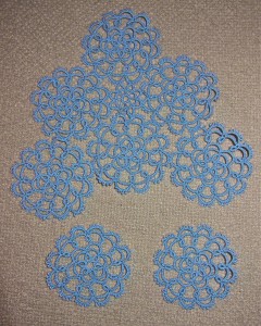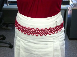 I forgot to take a close-up of the necklace I’m wearing in the first picture, but it’s actually the center part of the motif from the star doily I’m working on. I made it out of the same size 3 thread that the belt is made of so it’s pretty big and loved the way it came out. It’s nice to have such a bold piece of tatting. I wore it again on Tuesday with a red dress and got lots of comments on it.  I think I may have to start doing a lot more tatting in size 3. Originally, I picked size 3 for the belt just because I wanted it to work up really fast. As a proof-of-concept piece I didn’t want to spend a lot of time on this first “draft” and figured that when/if I made more I’d make them out of a smaller thread and more complicated pattern. I actually think now that size 3 totally works for the belt. I do plan on trying out some other patterns for belts but I think I’ll stick with the size 3.