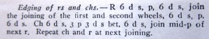 I think this was the second pattern in both the first and the third Priscilla books. The rings are all 3+3-3-3 with the first picot joining to alternating rows (so the 3rd ring joins to the 1st, the 4th ring joins to the 2nd, the 5th ring joins to the 3rd and so on). The only change I made was to leave out the first picot on the first ring of each row and the last picot on the last ring of each row. Then I folded the piece of tatting over the end of the ribbon and glued it down.