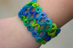 After tatting the bracelet I picked up a couple skeins of this yarn with the plan of making another belt out of it. I’ve even had the pattern picked out for a while (from Priscilla, of course) but I’ve been waiting until I could pick up some bigger shuttles. I really do not want to have to try adding more thread in the middle of a project with this stuff. Luckily, I think I can get an entire skein wound onto two (overwound) Tatsy shuttles, CTM. For this new project I picked out two skeins and will just use a small bit from each. I should probably try another project with a full skein so I can get a better idea of how much tatting I can get out of a skein, but that will have to wait for the future. No projects that I want to do with the yarn are coming to mind at the moment and the yarn is expensive enough that I don’t want to buy some just for an experiment. Luckily, they often have a remnants basket at Wildfibers with small pieces of this yarn. The bracelet above was made with one of the remnants. Since you need so little yarn for tatting I’ll be exploring that basket a lot. Unfortunately, they were sold out of remnants the last time I was there, but I really like the colors I bought so I’m sure I’ll be happy using them for a long time.