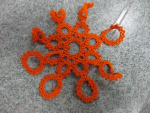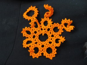 ea cloth, but at the moment I’m just focusing the center part – the first 4 rounds. Â In the close up here, though you can see that there’s going to be a lot more of these little circular motifs so they’re going to keep me busy. Â Unfortunately this also means lots and lots of ends to hide. Â As usual, I’m doing my first run through in size 10 Royle thread and not worrying about the ends, but eventually I’ll want them to look nicer. Â I’ve see a partially finished version and it’s much larger than you would first expect. Â The Lace Museum in Sunnyvale has one that has the center octagon finished (up to the point that the cloth pieces start) and even in a small thread it’s quite large. Â I had been thinking of making it in size 80, but as I look at it again and contemplate having to sew in all those ends I’m rethinking that idea. Â I think I’ll still make a couple versions of the center part (the first 4 rounds) in different sizes just for the size comparison, and to see how it goes. Â Since I started sewing in ends (instead of using the magic thread trick) I haven’t used size 40 or 50 much so maybe once I use them a bit more I’ll find they’re not too difficult to sew in.