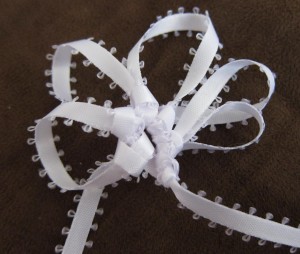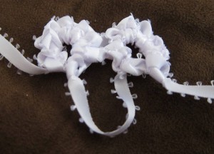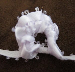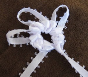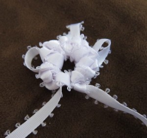 I think the reasons it didn’t work as well are probably partly because of my choice of ribbon and partly just because I need more practice.  The ribbon she had used (if I remember right) 3/4 of an inch wide and a smooth cloth.  This one was cloth but much smaller (1/4 of an inch) and with a little picot-like edging.  I thick the picot-like edging made it too busy.  If I were to try it again sometime I’d use an edging-less ribbon in this same size and a larger ribbon as well.  It was an interesting little project and a nice little 30-minute experiment.  I’m not in any rush to starting making much in ribbon at the moment, but I may try it again sometime.  Here’s the rest of all the other little rings I made.