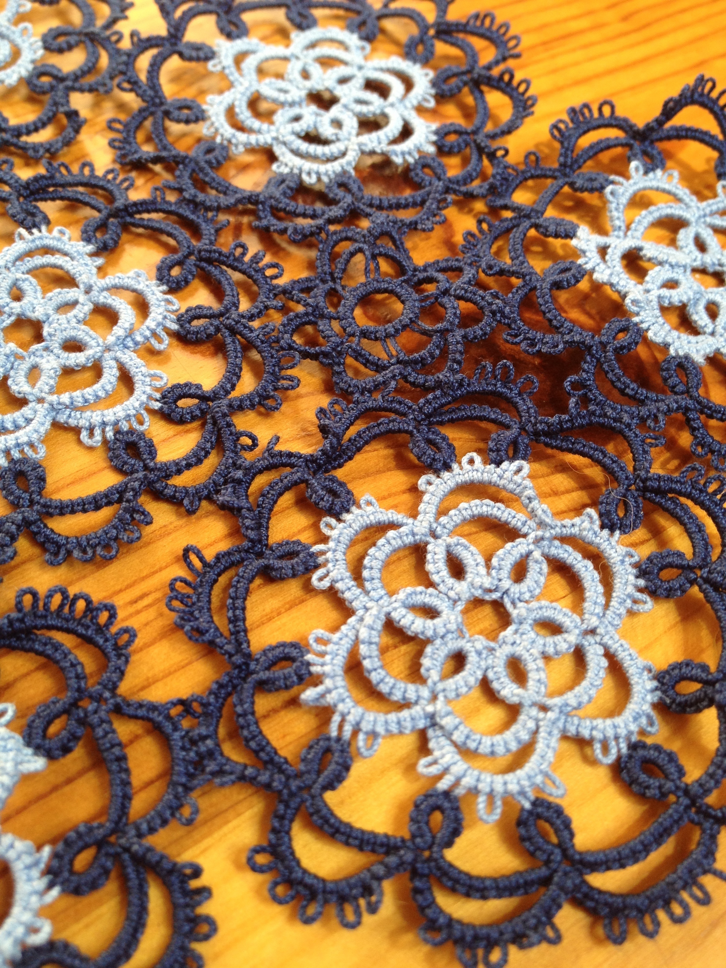 Fair Close up 2I took a picture of a close up of the fair piece so you can see what the motifs look like.  The pattern is from Priscilla Tatting Book #3 (1925).  I like this motif a lot and have made a bunch of pendants out of it it as well.  The final piece was 30 of these motifs and 5 of the smaller one you can see in the middle of this picture.  I made a bunch of extra light blue centers so when I was done with the fair piece I turned these into necklaces, by putting together 3 of them in different arrangements.  Pictures are needed for those too, but I still have to sew in the ends, so I’ll wait to take the pictures until I have that done and I put them on chains in their finished form.