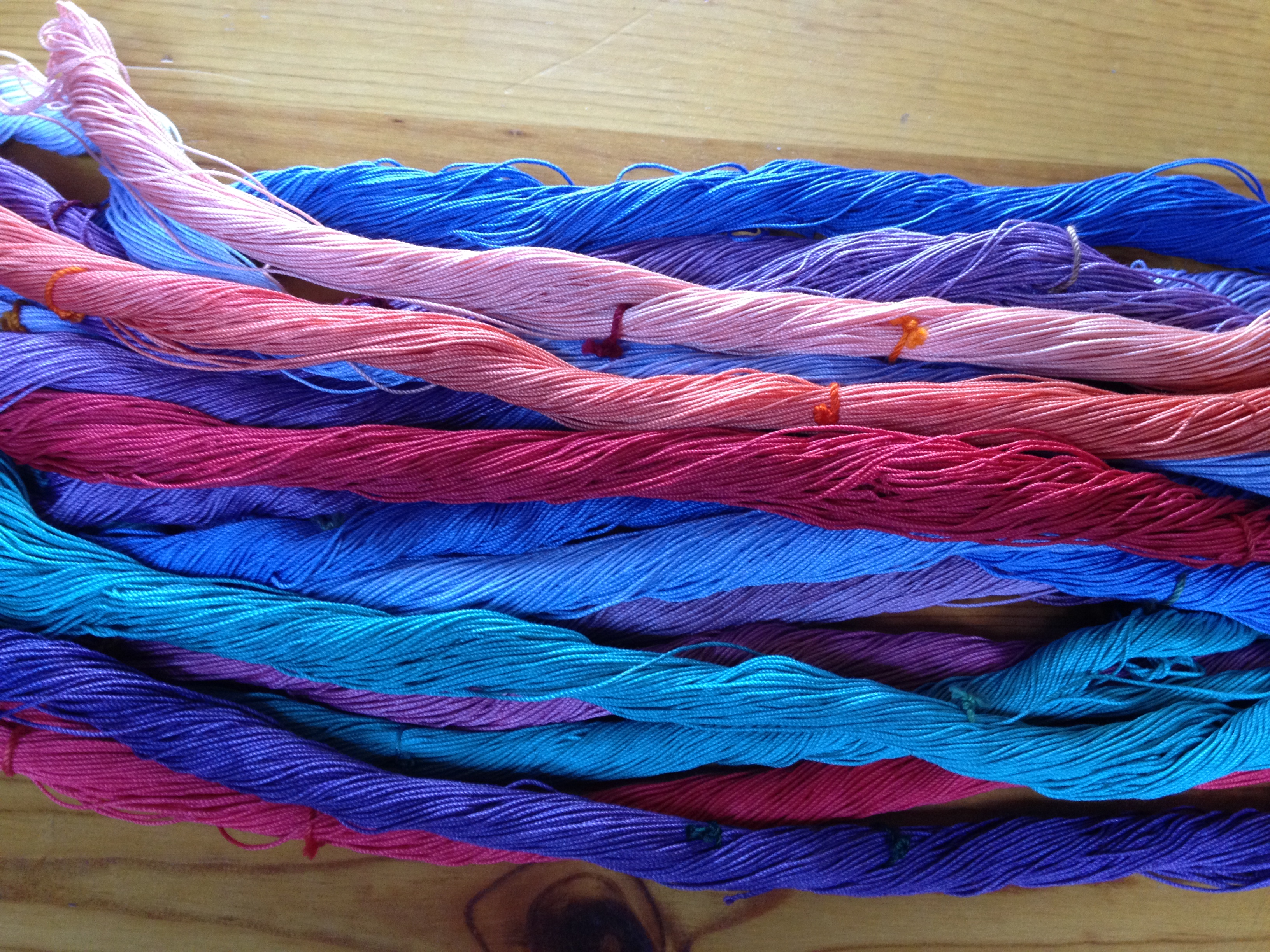 I picked up some new dye colors and played around with them this week. Â Here’s what I ended up with. Â They turned out much brighter than the last few batches, which is exactly what I was going for. Â I’m very excited about how the orange and teal came out. Â Came out with a nice set of different shades of purple as well. Â Only catch is that I never seem to use up all the thread I dye. Â Guess I know what I’m giving to the tatters on my Christmas list!