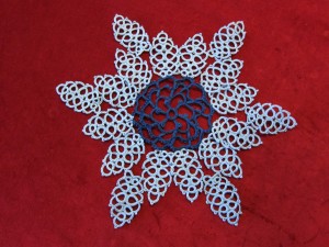 I played around with it in size 20 thread and actually got to liking it though I didn’t get too far. Just enough to figure out a way to make two of the leaves at the same time while attaching them to the center motif while tatting them. That was two months ago and of course now I can’t find those pieces that I was playing around with, but I have decided to go ahead and try out the center part of the project. I make no promises to doing the whole thing, but I just had to try some more of it.